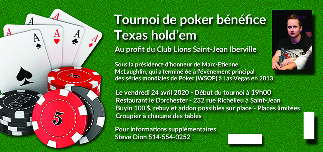 Jouez pour une bonne cause en participant au tournoi de Texas Hold’em annuel du Club Lions St-Jean, présidé par nul autre que le professionnel du WSOP Marc-Étienne McLaughlin. Avec ses places limitées à 72 joueurs, cet événement se veut être une superbe soirée à chaque édition.